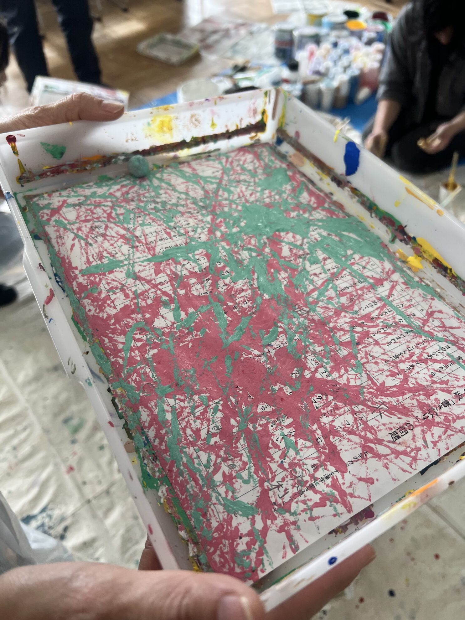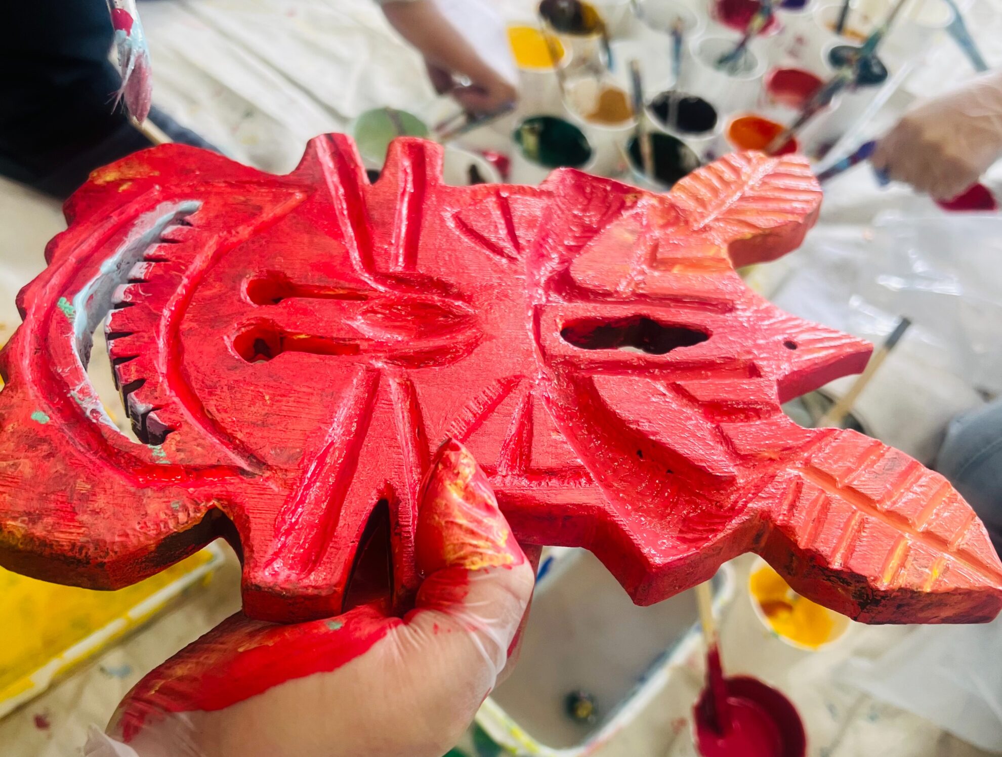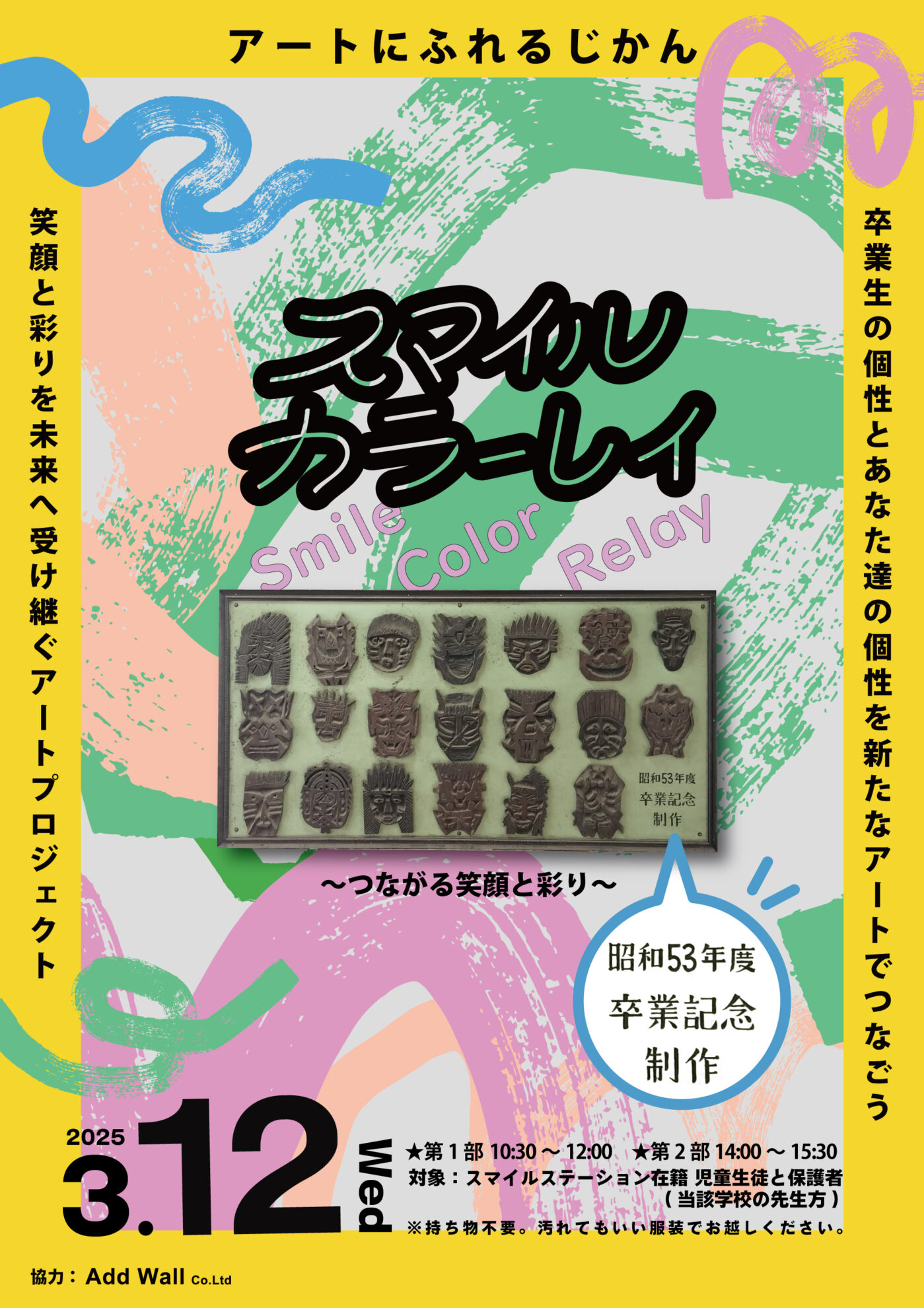 「たいせつにしたい。校舎に残る小さなカケラ」 この作品は、前教育支援センター(戎小学校旧校舎)に展示されていた、昭和53年度(1978年)の戎小学校の卒業制作をアレンジしたものです。校舎の解体が決まり、メッセージを届けるアートプロジェクトが立ち上がったとき、階段の踊り場に静かにたたずむこのお面達に出会い、込められた想いを、未来へつなげたいと感じました。卒業生の作品に敬意を込めながら、令和6年度のスマイルステーションに通う子どもたちは、指先で木に触れ、ぬくもりを感じながら、自由な色彩で新たな命を吹き込みます。「ありがとう」の気持ちを重ねて、生まれたのが、《スマイル・カラーレイ》です。タイトルには、「笑顔と彩りがつながりながら、光のように広がっていく」という想いが込められています。変化の大きな社会の中でも、いつの日も「笑顔で人とつながり、自分の個性と彩りを発揮していくことの大切さ」を——この作品が、静かに伝えてくれることを願っています。