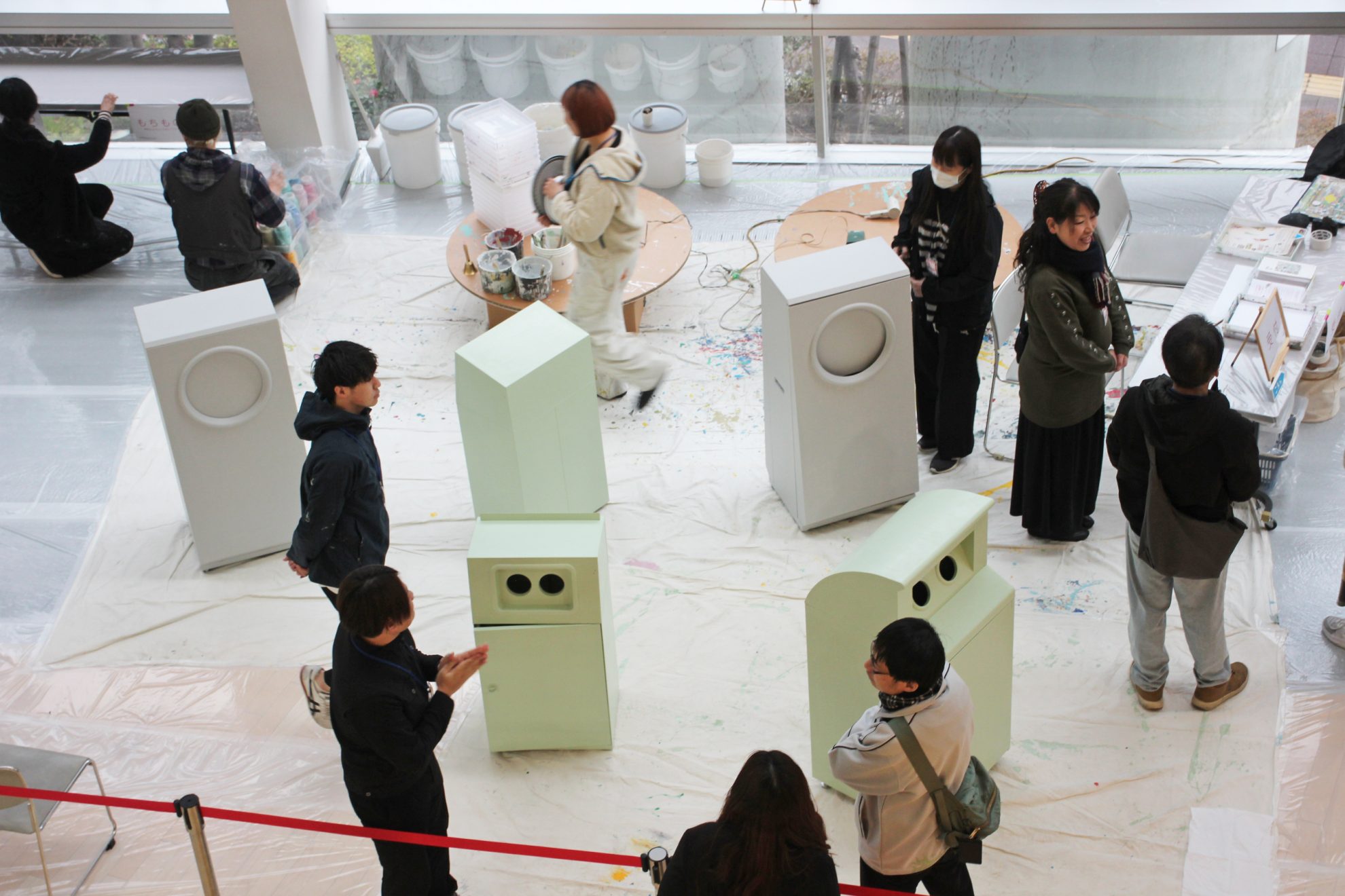本ワークショップは、近畿大学医学部・病院の泉ヶ丘移転を心から歓迎する「WELCOME」の想いを込め、旧キャンパスで実際に使用されていたごみばこを素材に、「ころころアート」の手法で彩り、マチの新しいアート作品へと生まれ変わらせる取り組みです。今回は応募いただいた50名の皆さまとともに、ひとつひとつのごみばこに色や記憶、表現を重ねていきました。