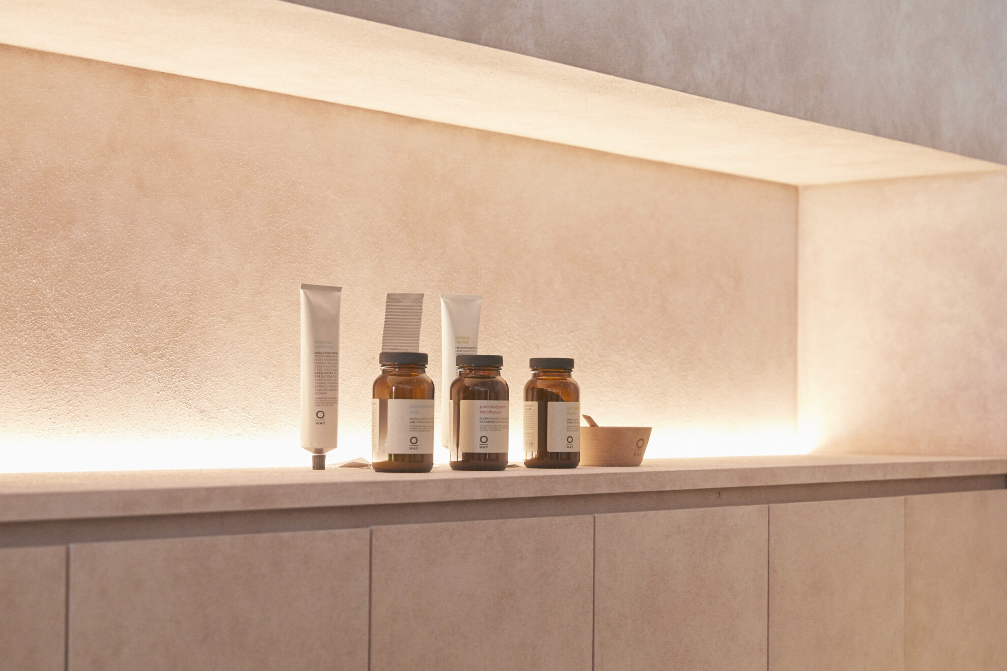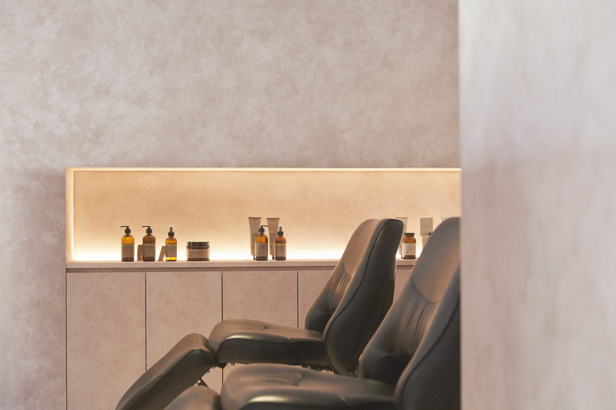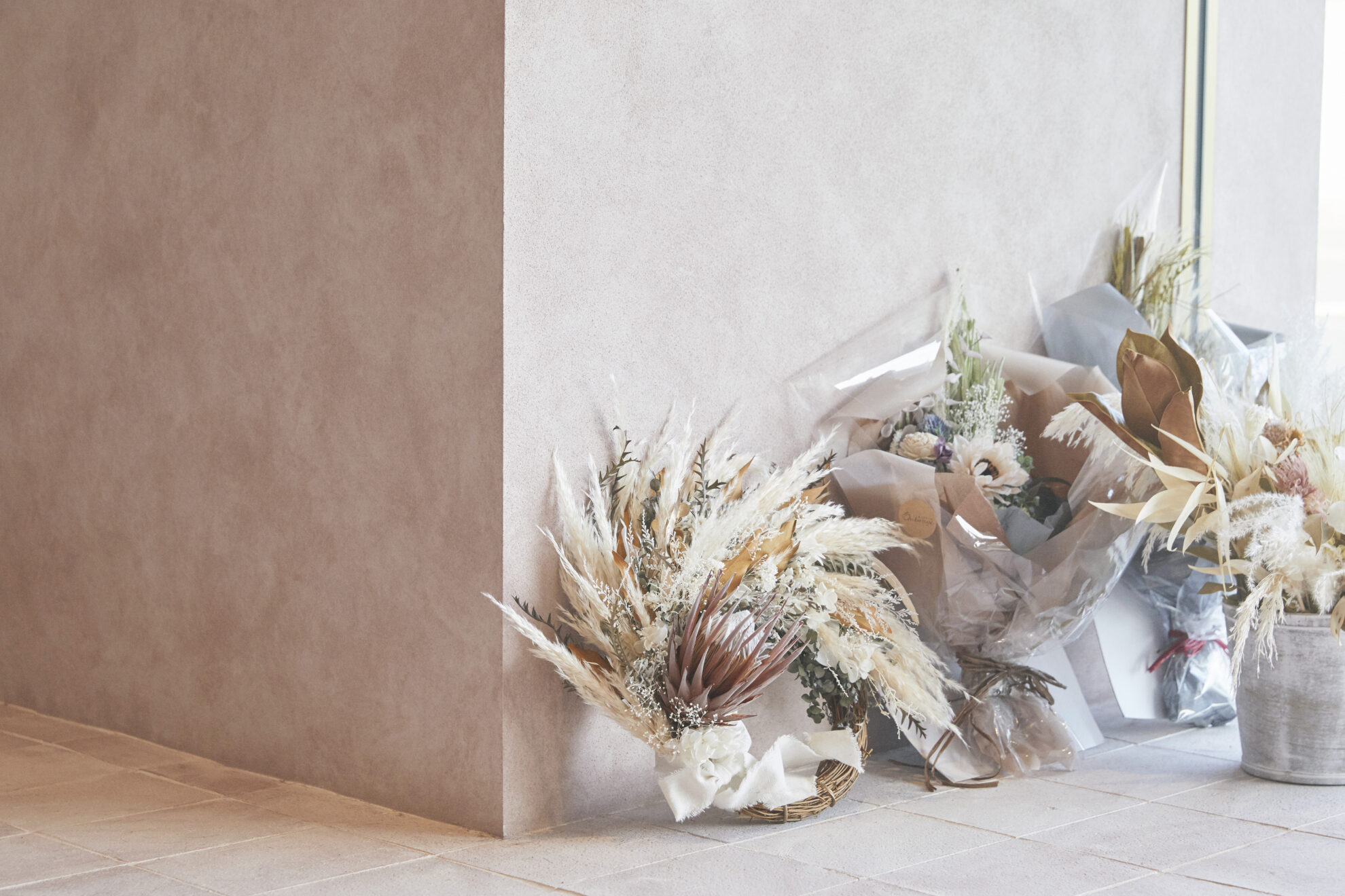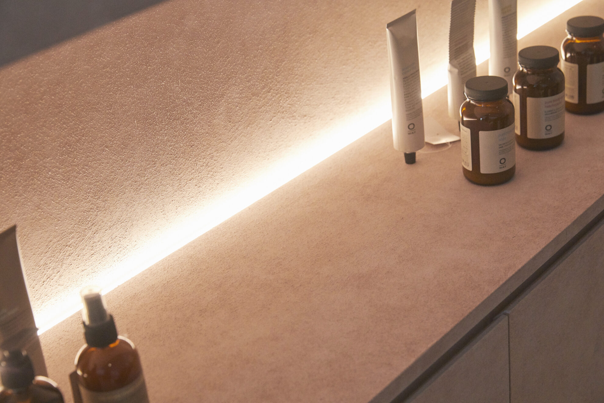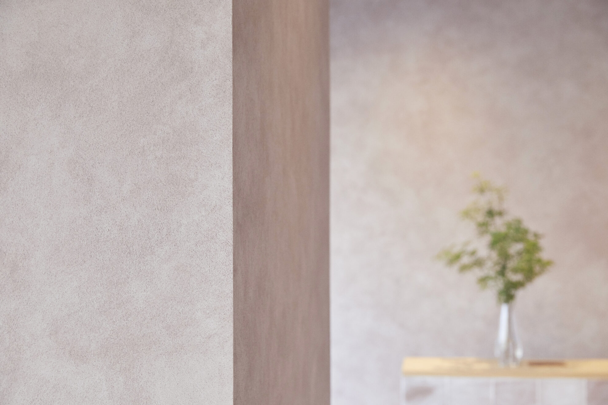 下塗りで使用したSTONE PAINT COARSEのシャープな雰囲気と大人っぽい落ち着いたピンク味のあるカラーがとてもマッチして落ち着ける空間となっております。