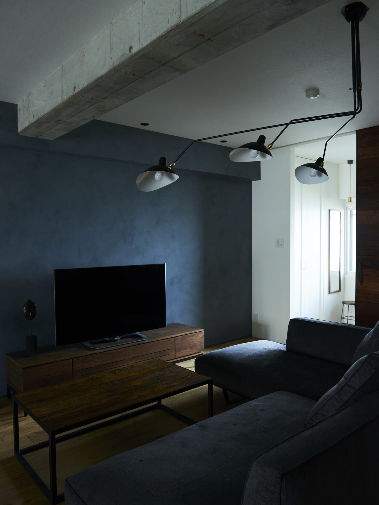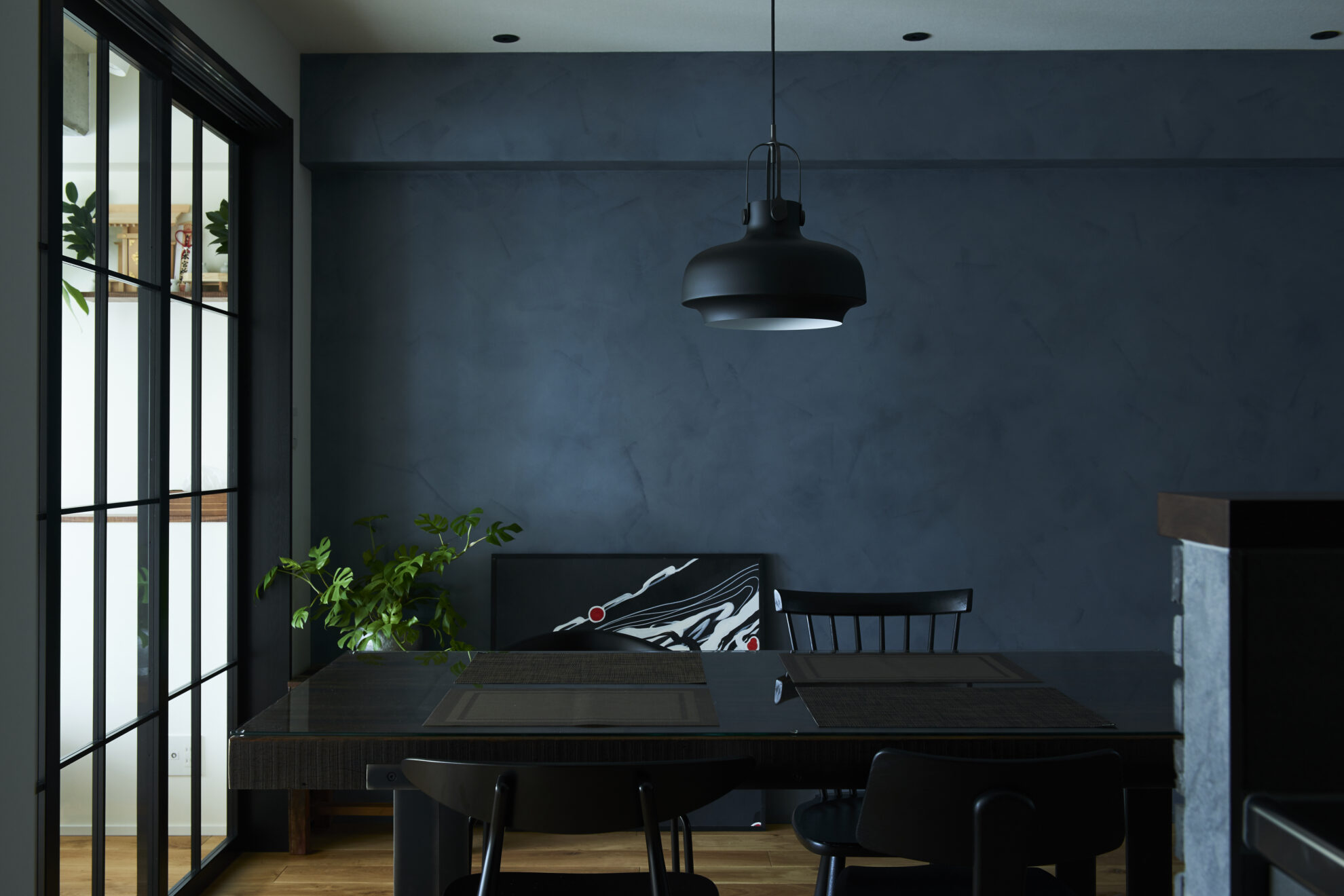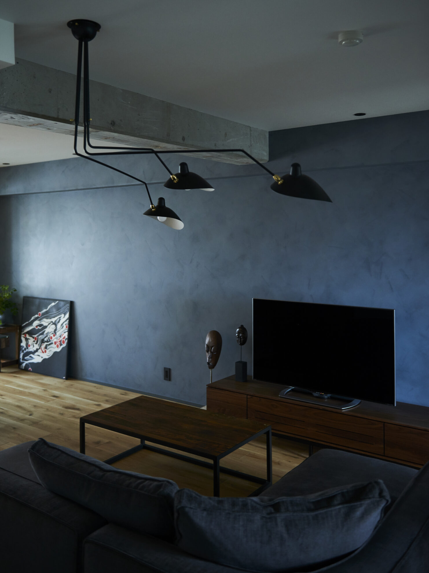 築30年の中古マンションのリノベーション。17帖のLDKのメインとなる壁面にPORTER'S PAINTSを使用いただきました。チョークを配合する歴史の古いDISTEMPERは、柔らかな自然なムラ感が大きな特徴です。施主様のご希望が濃色ということだったので、全体が暗くなりすぎないような色を選びとても照明や家具などとマッチしたシックな空間になりました。