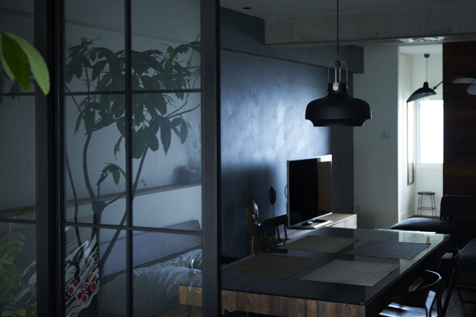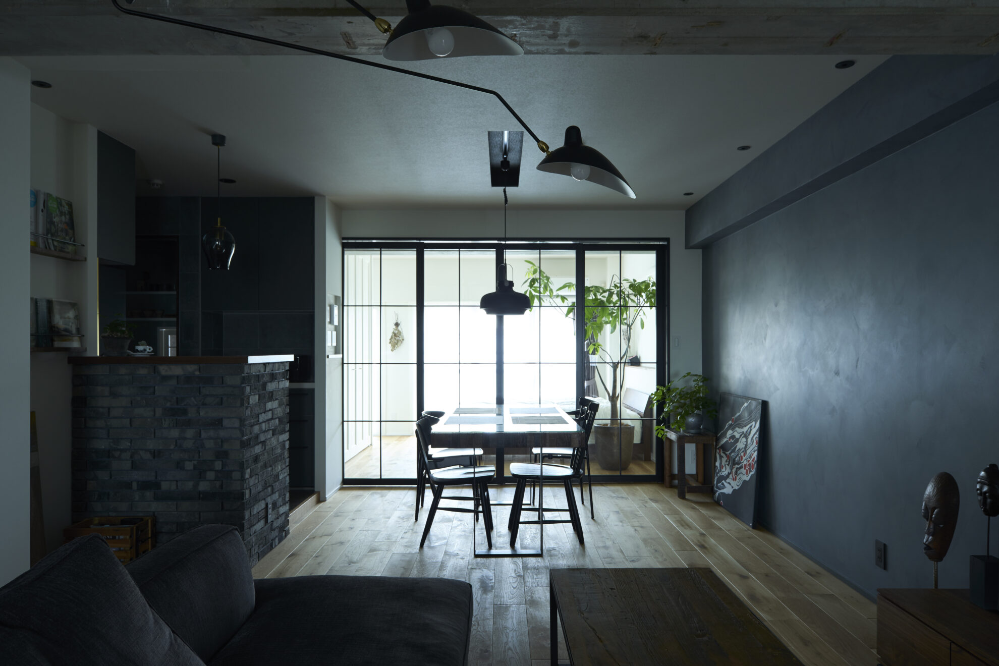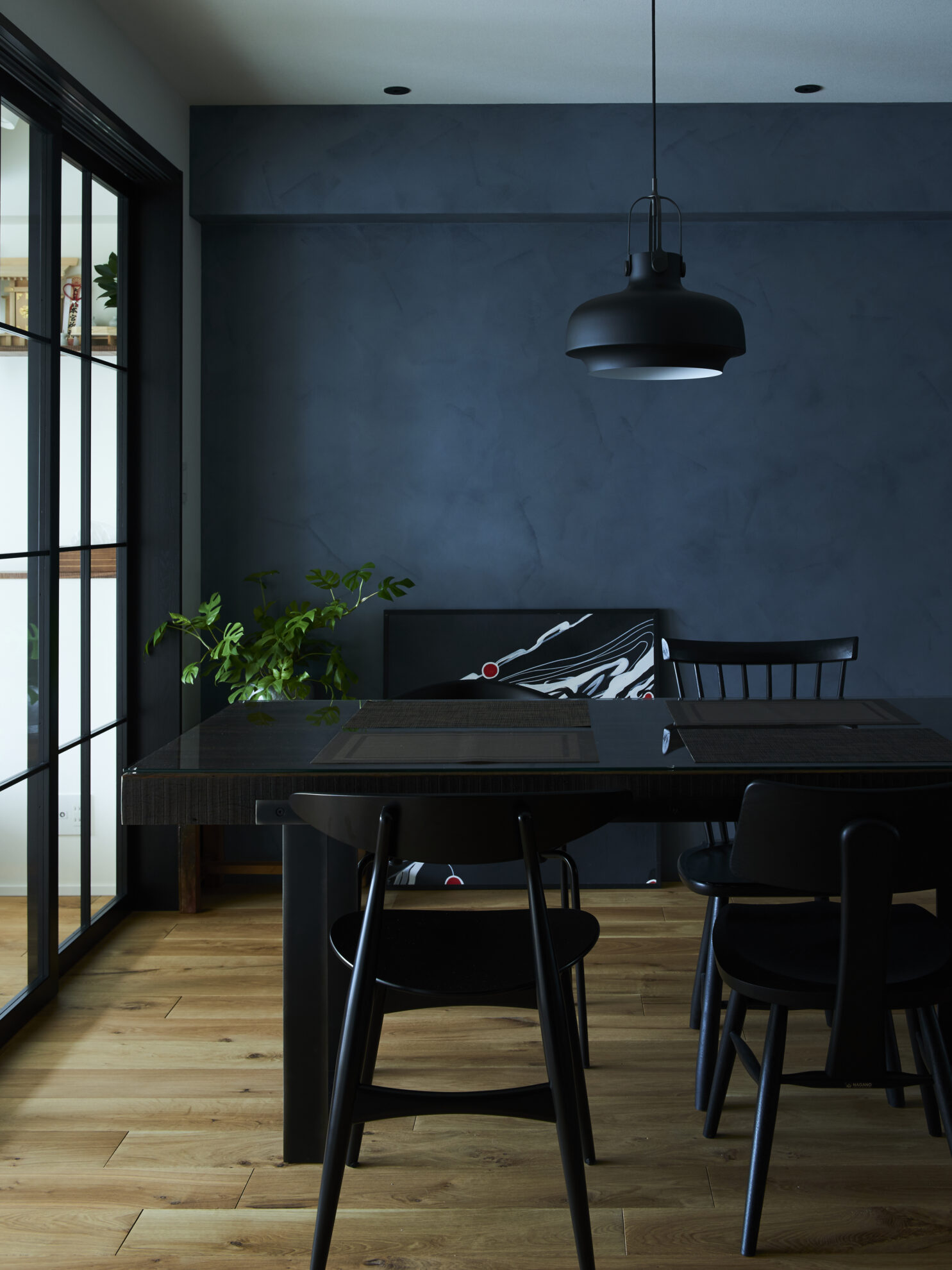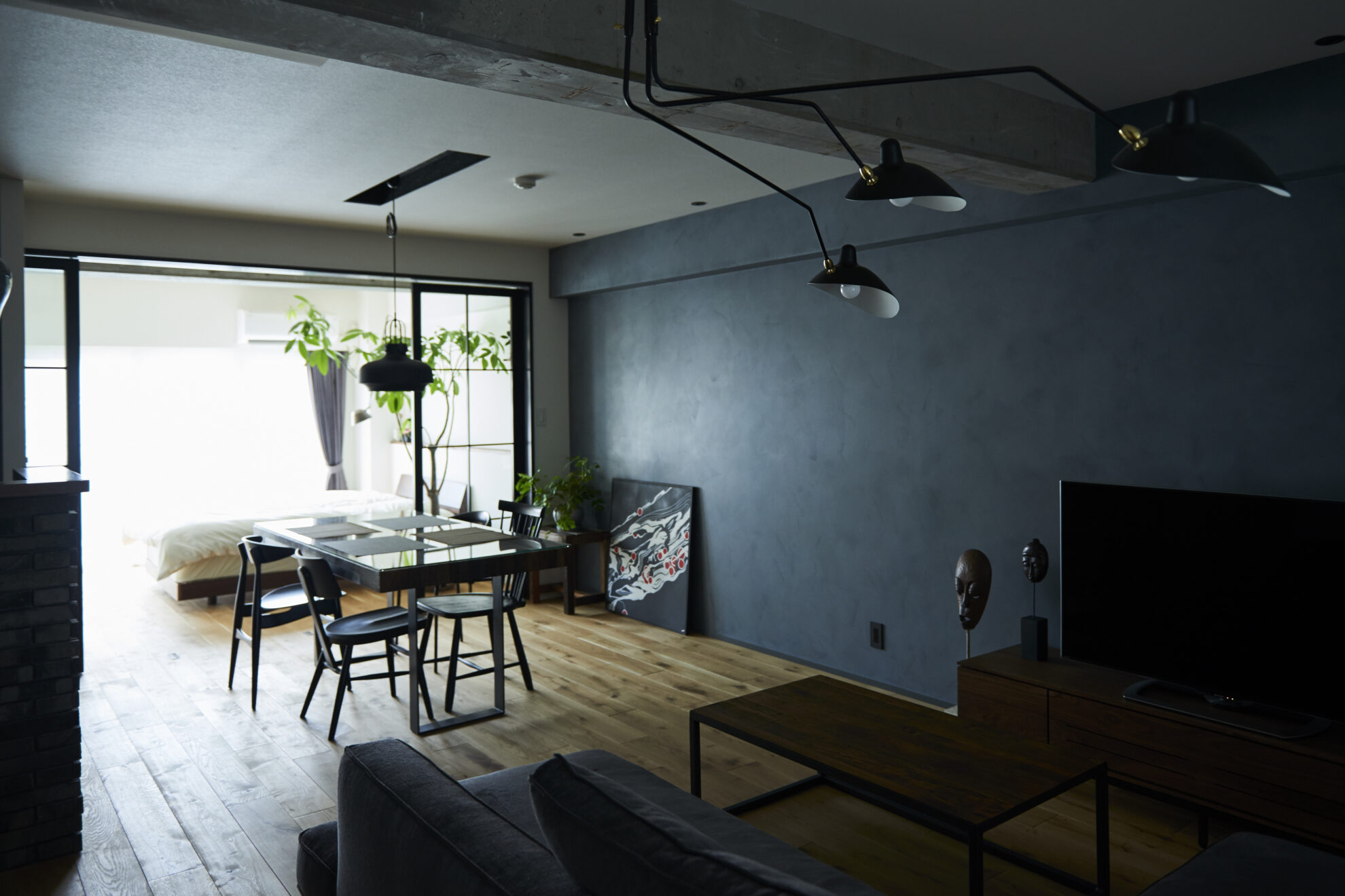 築30年の中古マンションのリノベーション。17帖のLDKのメインとなる壁面にPORTER'S PAINTSを使用いただきました。チョークを配合する歴史の古いDISTEMPERは、柔らかな自然なムラ感が大きな特徴です。施主様のご希望が濃色ということだったので、全体が暗くなりすぎないような色を選びとても照明や家具などとマッチしたシックな空間になりました。